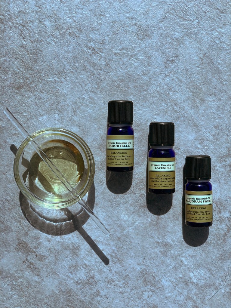 另外也可使用 Neal’s Yard Remedies的 無添加基礎油膏 調製3%的精油,來作為基礎保養,可以適量的塗抹在喉嚨、胸口及太陽穴,建議配方為:桉油樟羅文沙葉精油、沉香醇百里香精油、佛手柑精油及純正薰衣草精油。膏含有較高比例的蜂蠟,除了有很好的滋潤效果外,也同時能形成一層薄薄的保護膜,給肌膚帶來防護及隔絕外界直接的傷害喔!