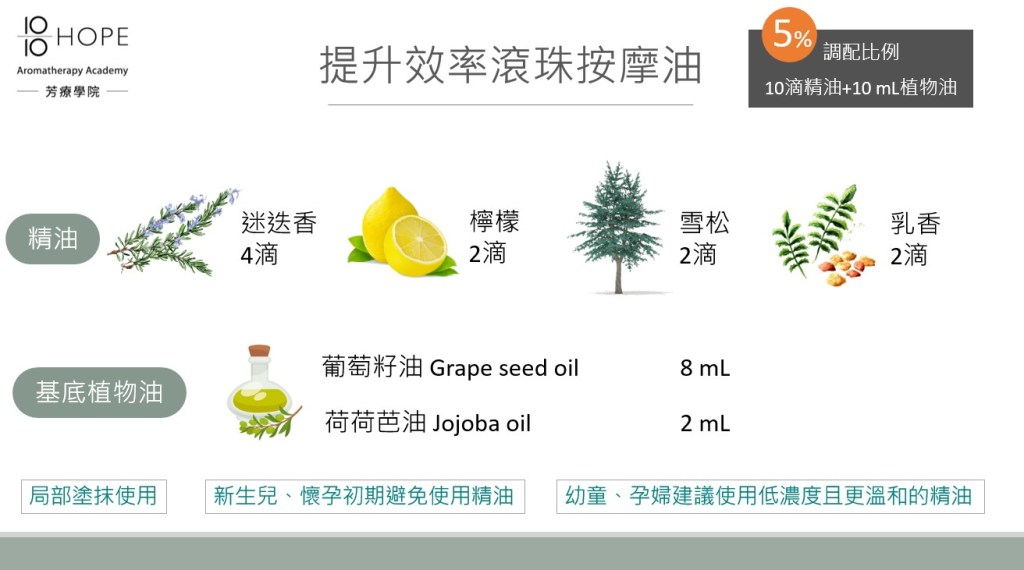 特別叮嚀:因為3歲以下小朋友代謝與皮膚功能尚不完善此配方不建議使用;三歲以上小朋友建議降低精油濃度使用。